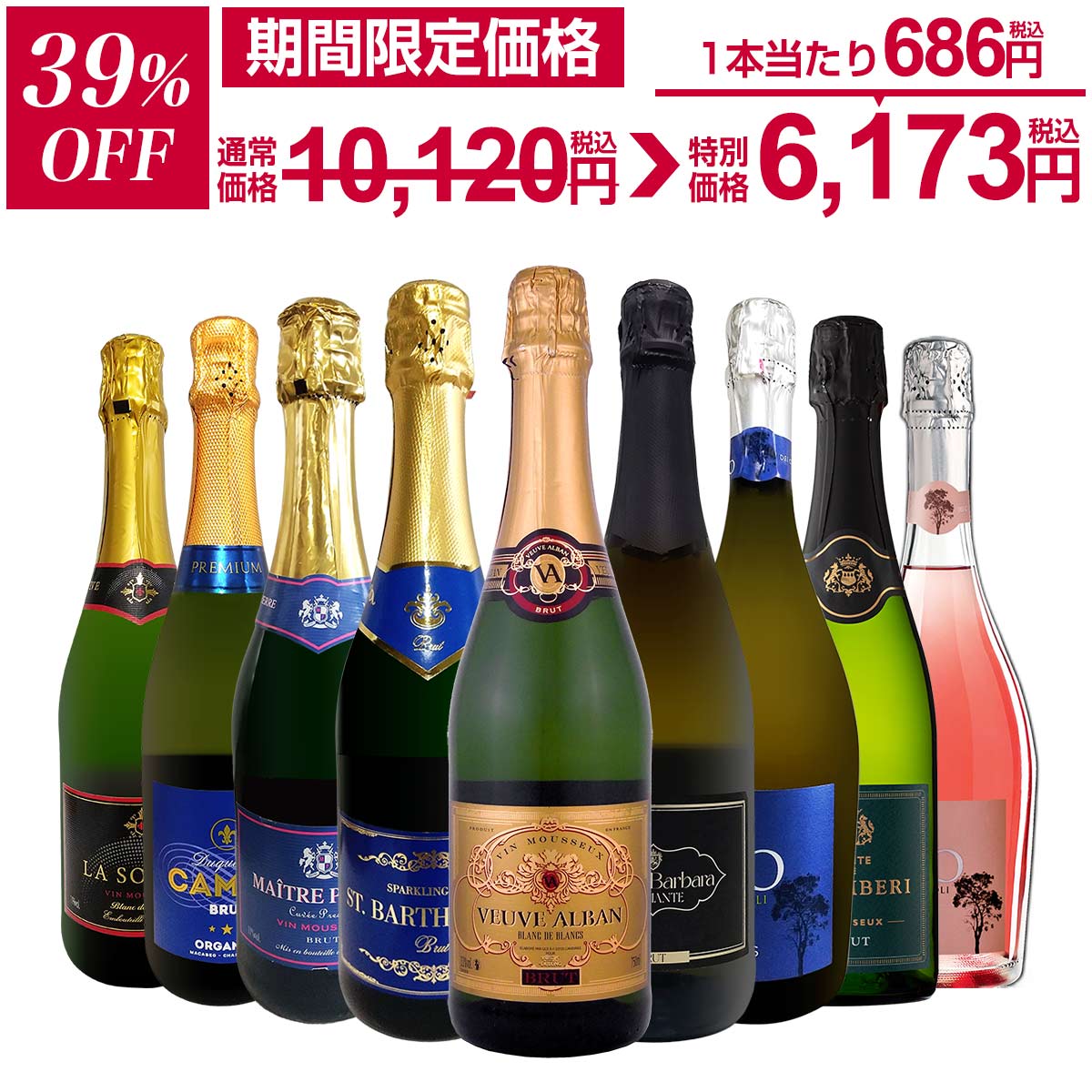 夢の9本揃い踏み!当店ソムリエが厳選した辛口スパークリングワイン9本セット!シャンパン製法のカヴァ(カバ)を始め、世界各国の爽快なスパークリングワインが9本詰まってお買い得価格でご案内!●シリーズ累計