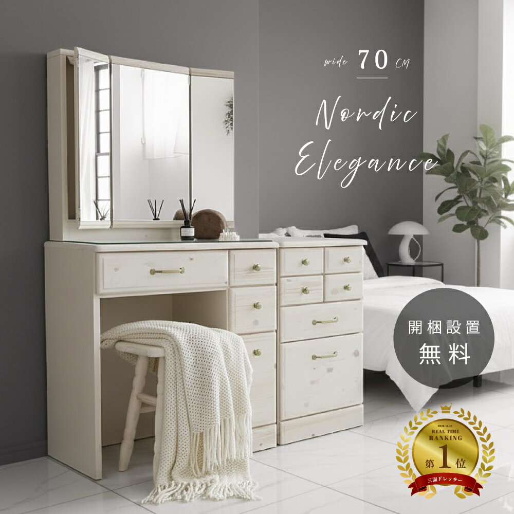 サイズ (本体):約幅70×奥行43.5×高さ135.5cm (スツール):約幅35×奥行30×高さ42cm 材質 (天板、引出し前板、ミラー上・下かざり部):北欧フィンランドパイン無垢材 (側面、内