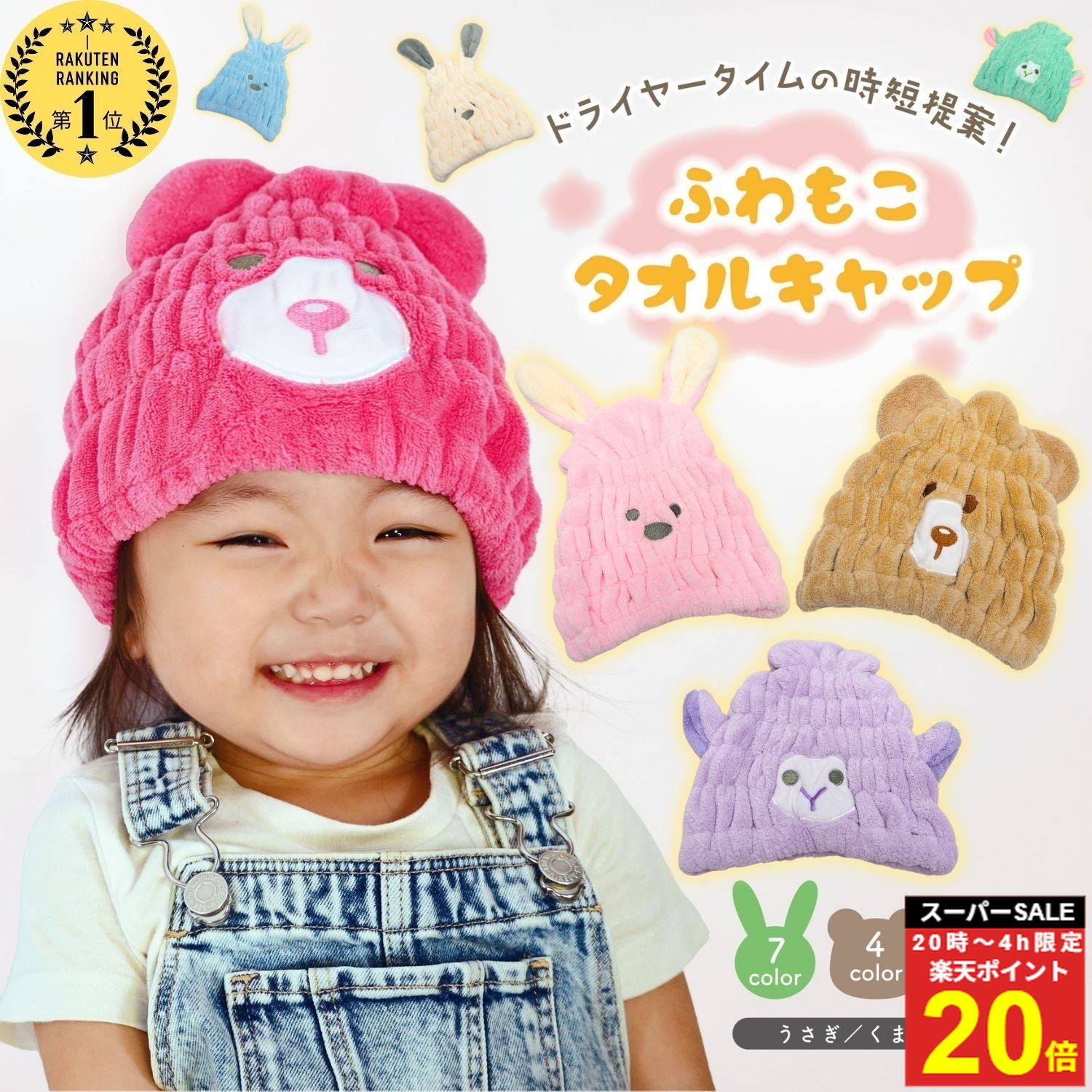 【2点セットのヘアキャップ】 ・うさぎとくまのかわいいヘアキャップ ・選べる6色のカラーバリエーション ・ふわふわのタオル素材で頭をやさしく包む 【安心素材】 ・濡れた頭部をしっかり吸水すぐ乾く ・蛍