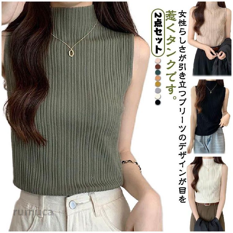 【2点セット】女性らしさが引き立つプリーツのデザインが目を惹くタンクです。ハイネックで華やかさのある一枚。上品顔に演出してくれるデザインでレイヤードにも使いやすく、洗練された印象に。デイリーユースはも